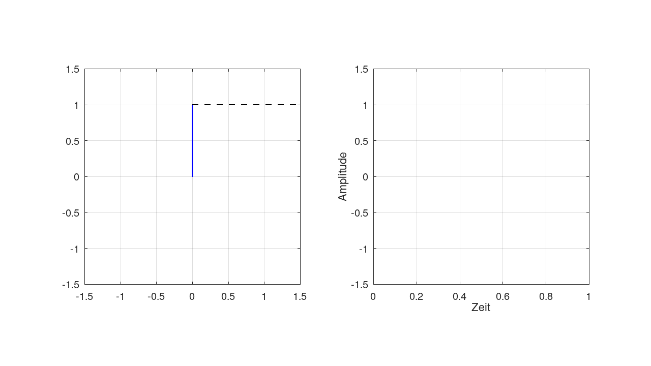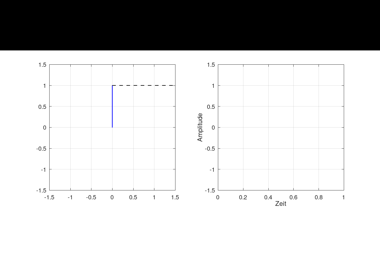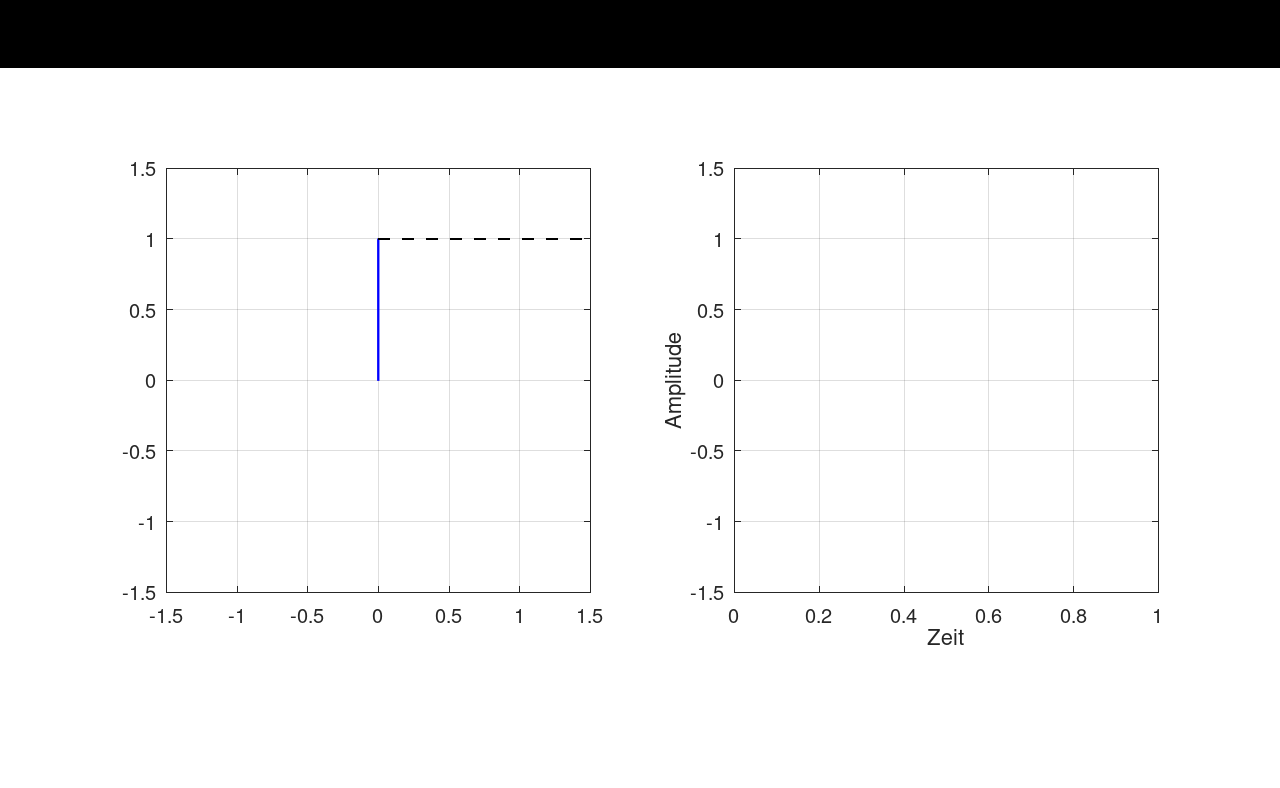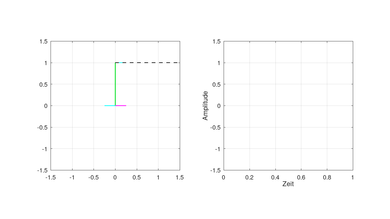 Die Amplitude ist die Länge des Zeiger. In diesem Beispiel ist die Amplitude 1 und die Frequenz 5 Hz (5 Umdrehungen pro Sekunde).